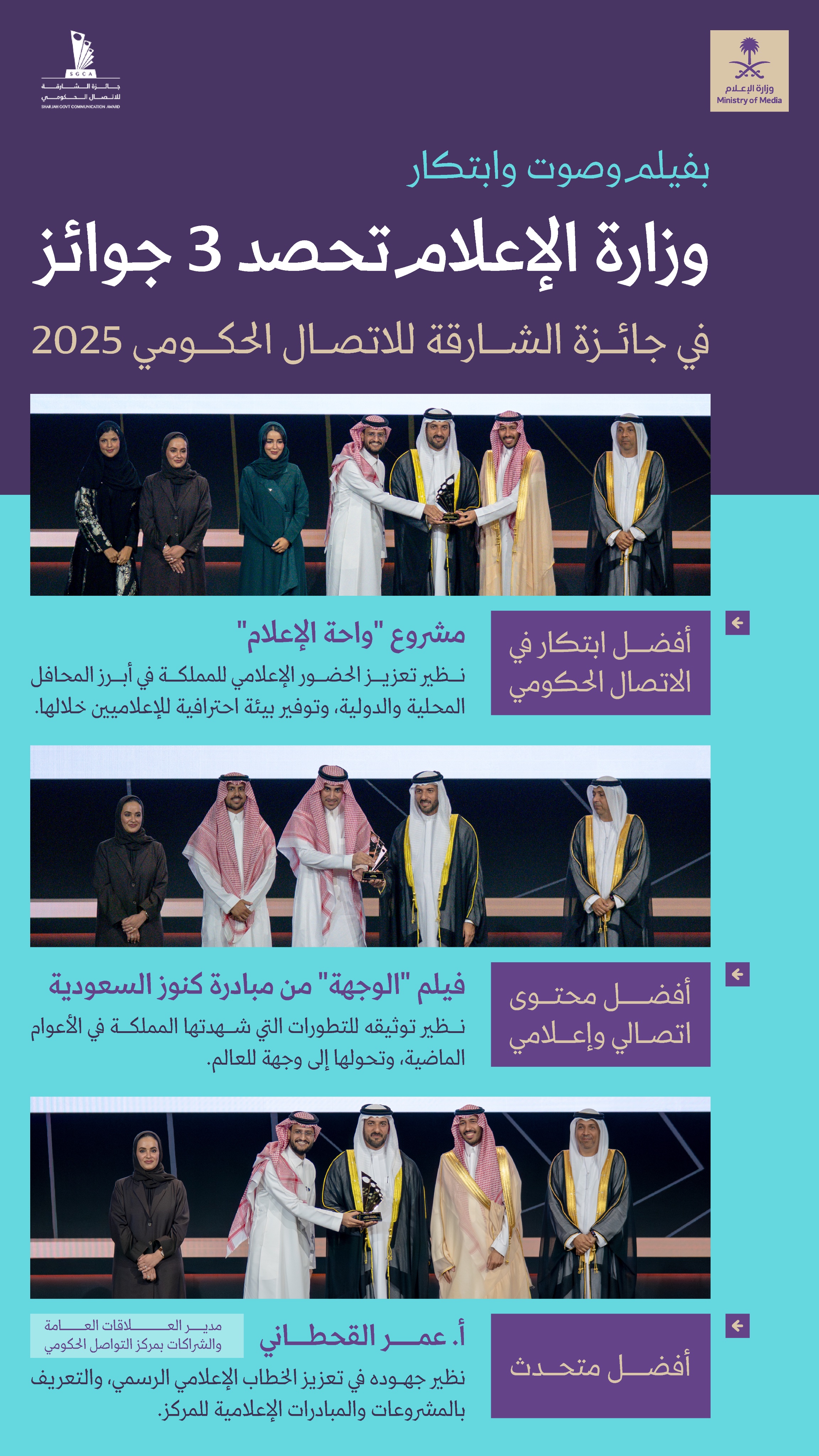 بفيلم وصوت وابتكار؛ وزارة الإعلام تحصد 3 جوائز ضمن جائزة الشارقة للاتصال الحكومي 2025.