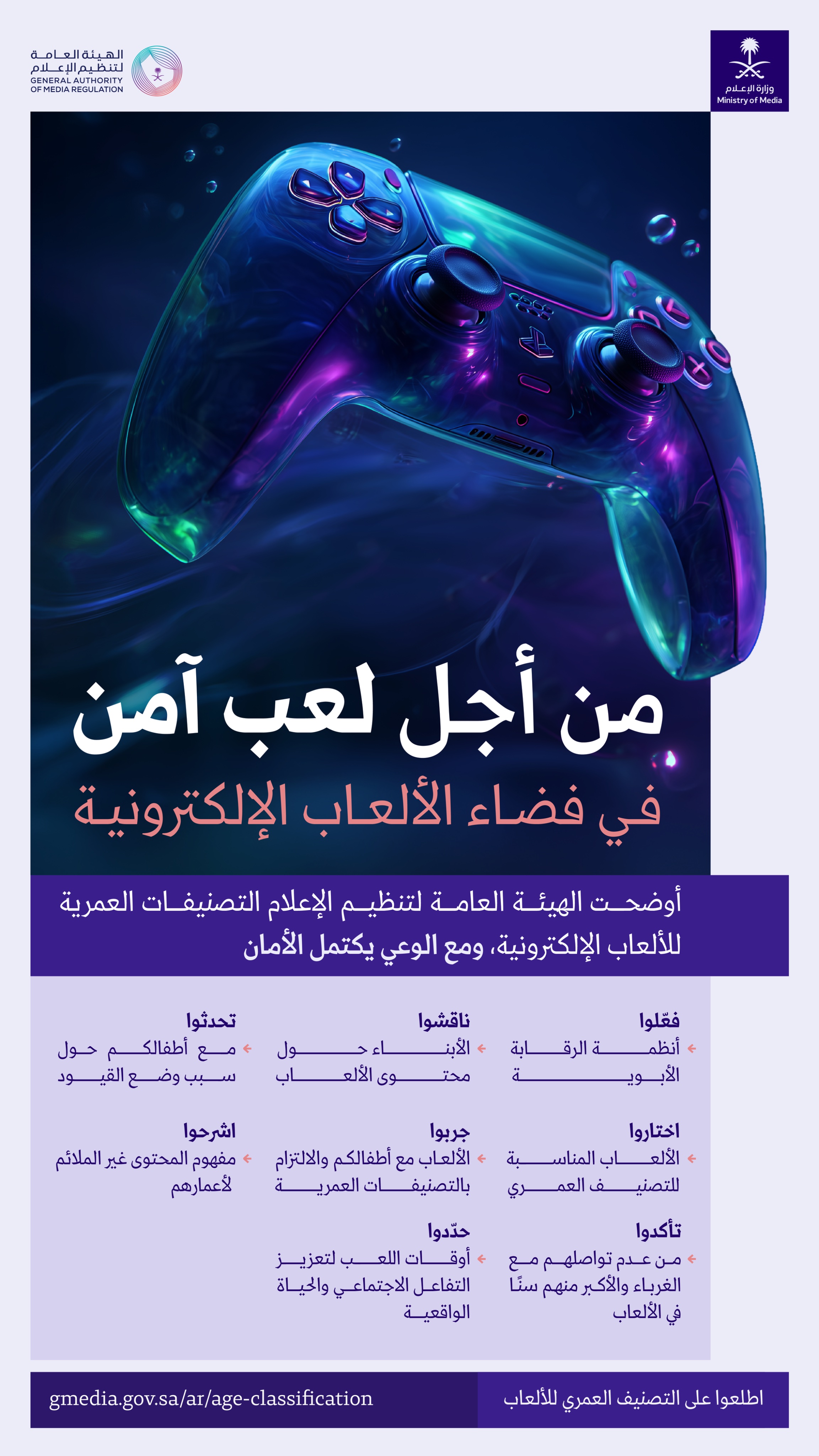 بمعرفتك بالتصنيفات العمرية للألعاب الإلكترونية ووعيك بممارسات الحماية؛ تمنح أبناءك لعبًا آمنًا وتجربة أكثر وعيًا.