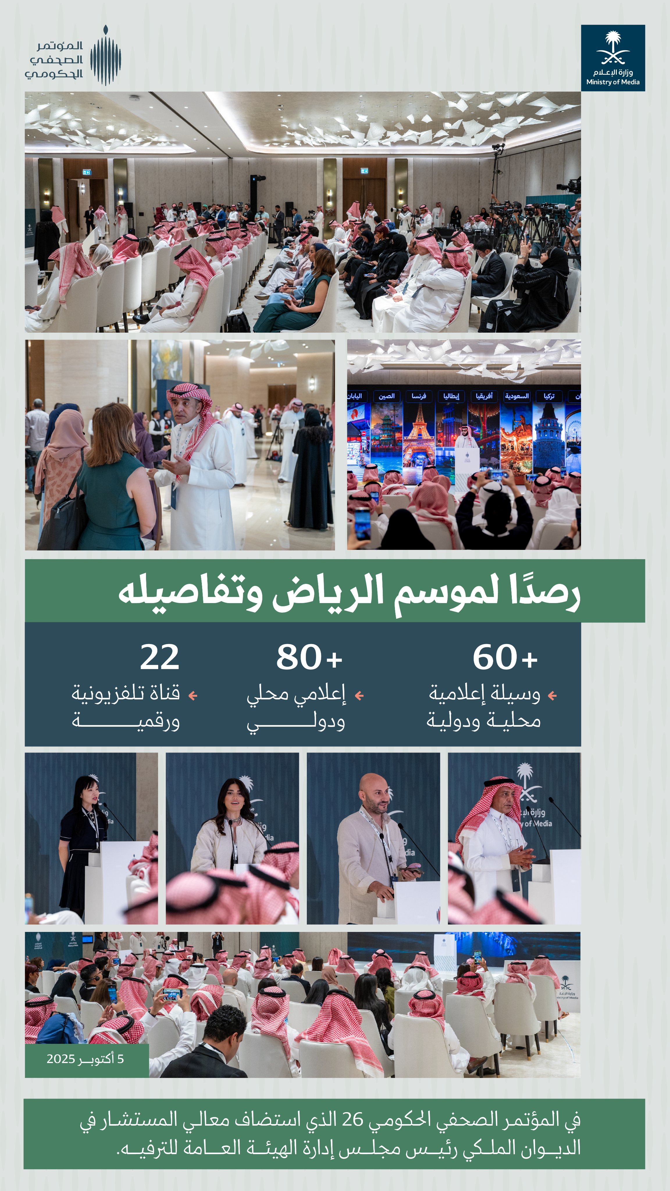 جانب من الحضور الإعلامي المحلي والدولي المشارك في المؤتمر الصحفي الحكومي الـ 26 الذي استعرض تفاصيل موسم الرياض 2025.