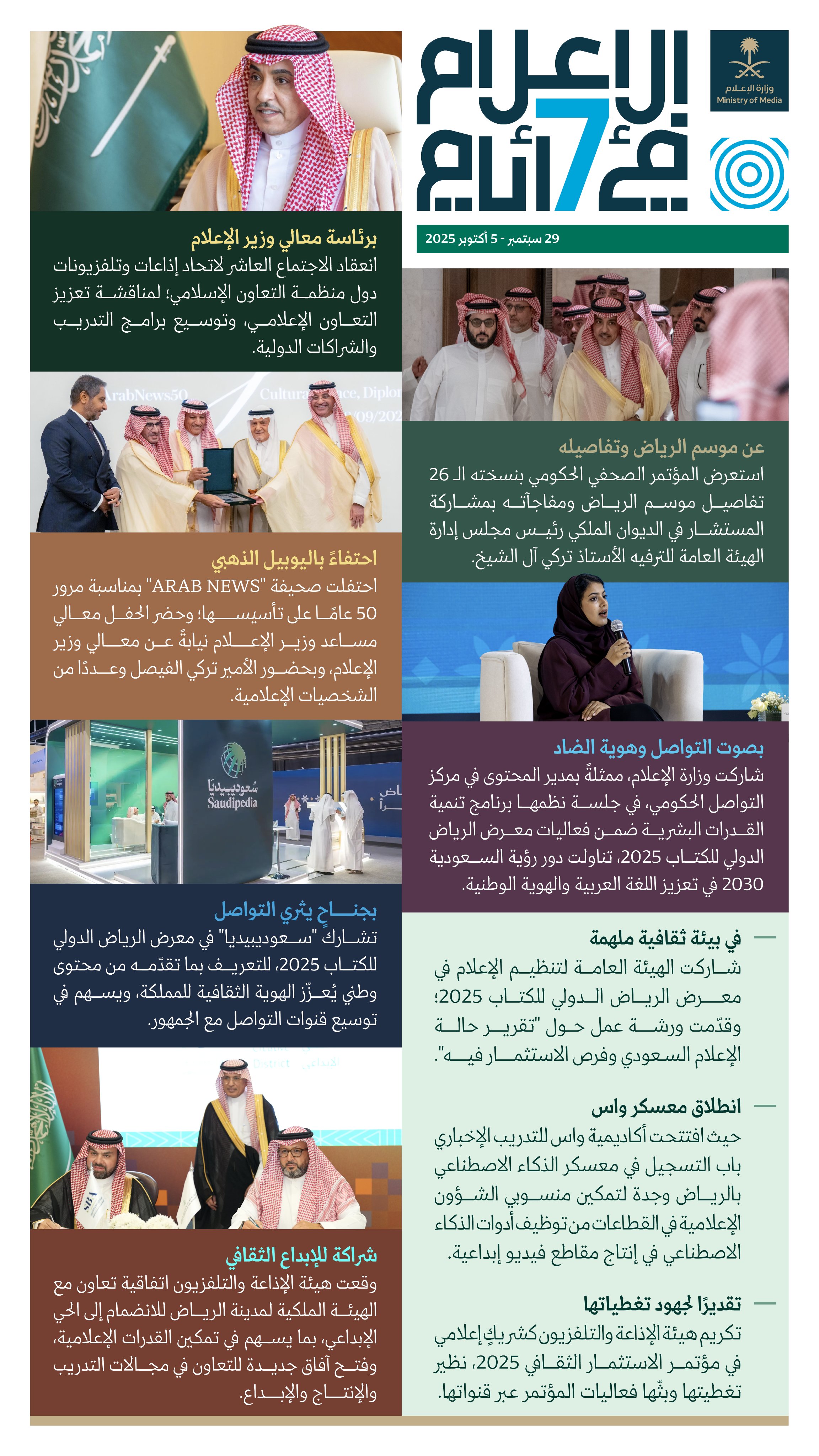 معالي وزير الإعلام يشارك في الاجتماع العاشر لاتحاد إذاعات وتلفزيونات دول منظمة التعاون الإسلامي، وانعقاد المؤتمر الصحفي الحكومي بنسخته الـ 26؛ الإعلام في 7 أيام.