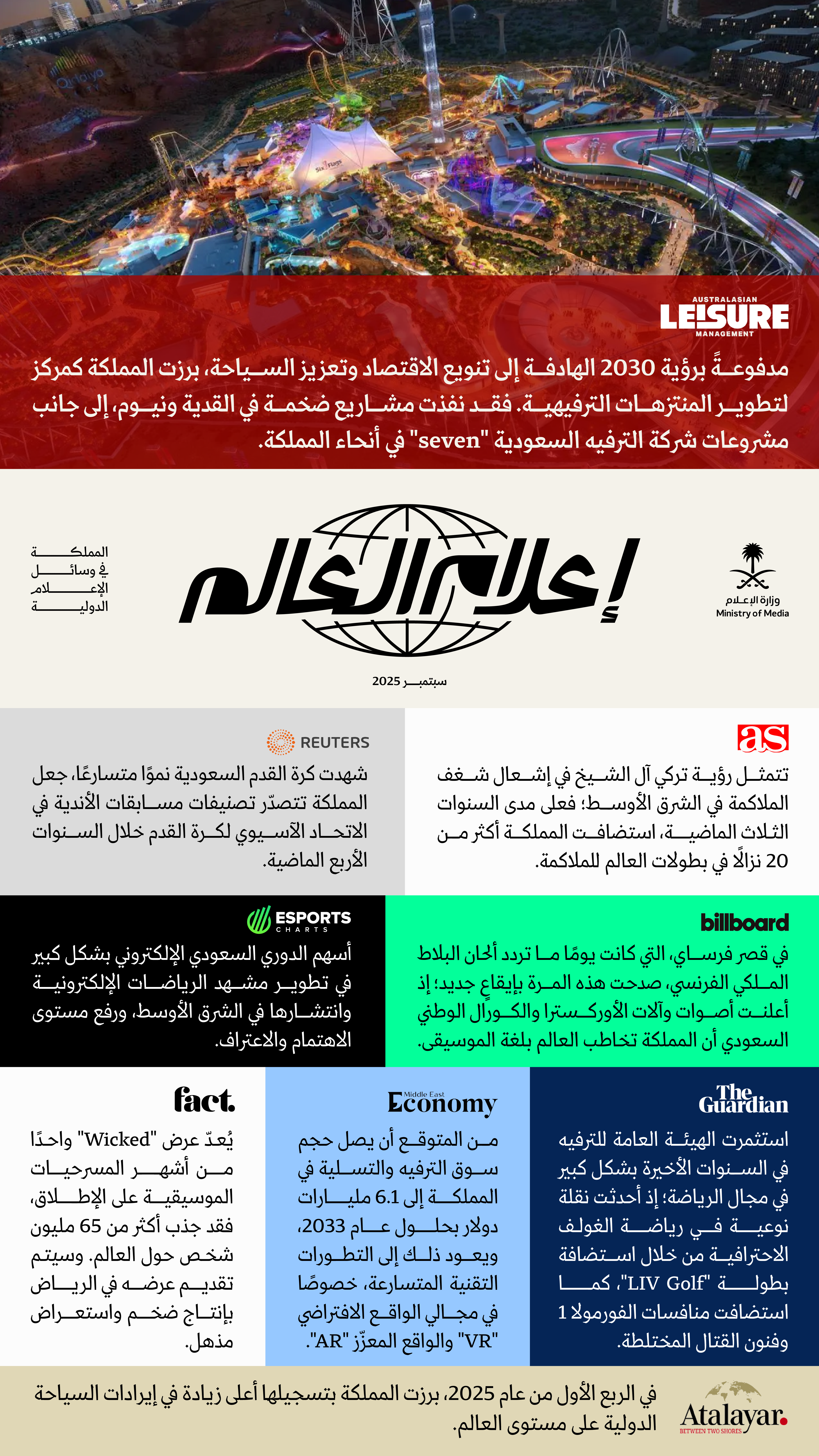أحدثت نقلة نوعية في رياضة الغولف الاحترافية، وسجلت أعلى زيادة في إيرادات السياحة الدولية على مستوى العالم؛ المملكة في إعلام العالم.