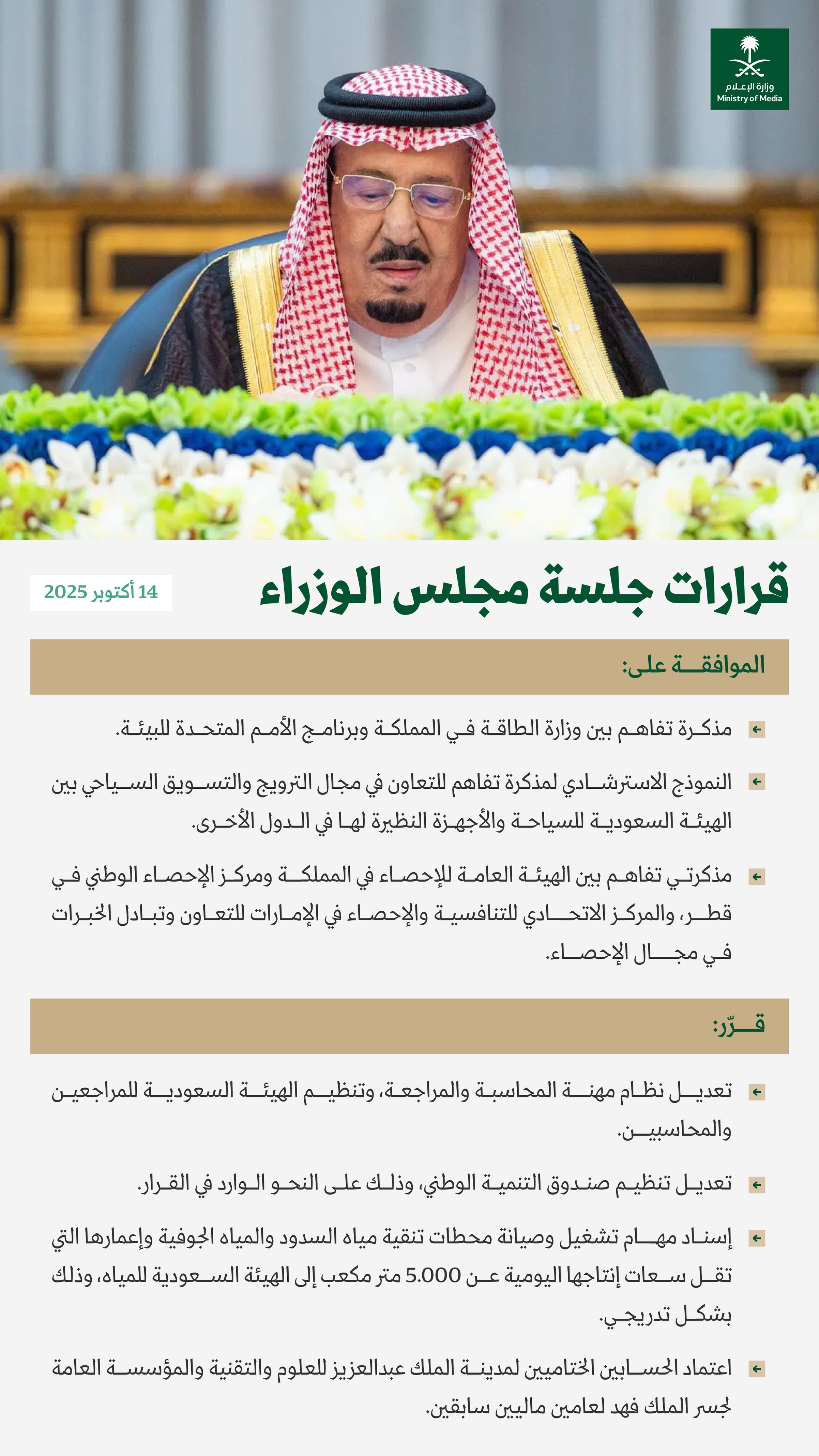 تعديل نظام مهنة المحاسبة والمراجعة وتنظيم الهيئة السعودية للمراجعين والمحاسبين، وتعديل تنظيم صندوق التنمية الوطني؛ أبرز ما جاء في قرارات مجلس الوزراء.