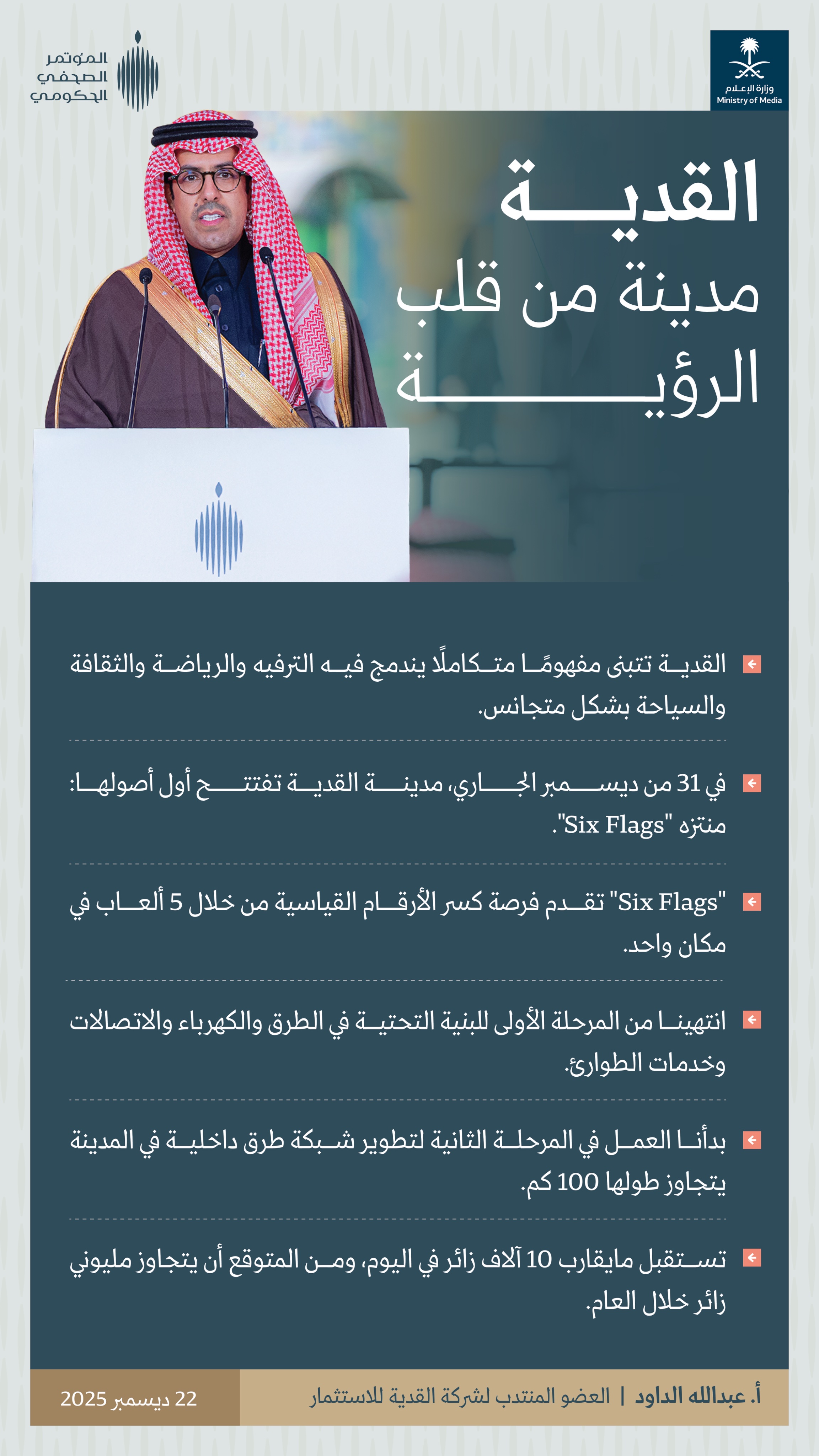 "إلقاء نظرة على مستهدفات رؤية 2030، سيجعلك تدرك أن مشروع القدية يأتي من قلب الرؤية"؛ سعادة العضو المنتدب لشركة القدية للاستثمار خلال المؤتمر الصحفي الحكومي.