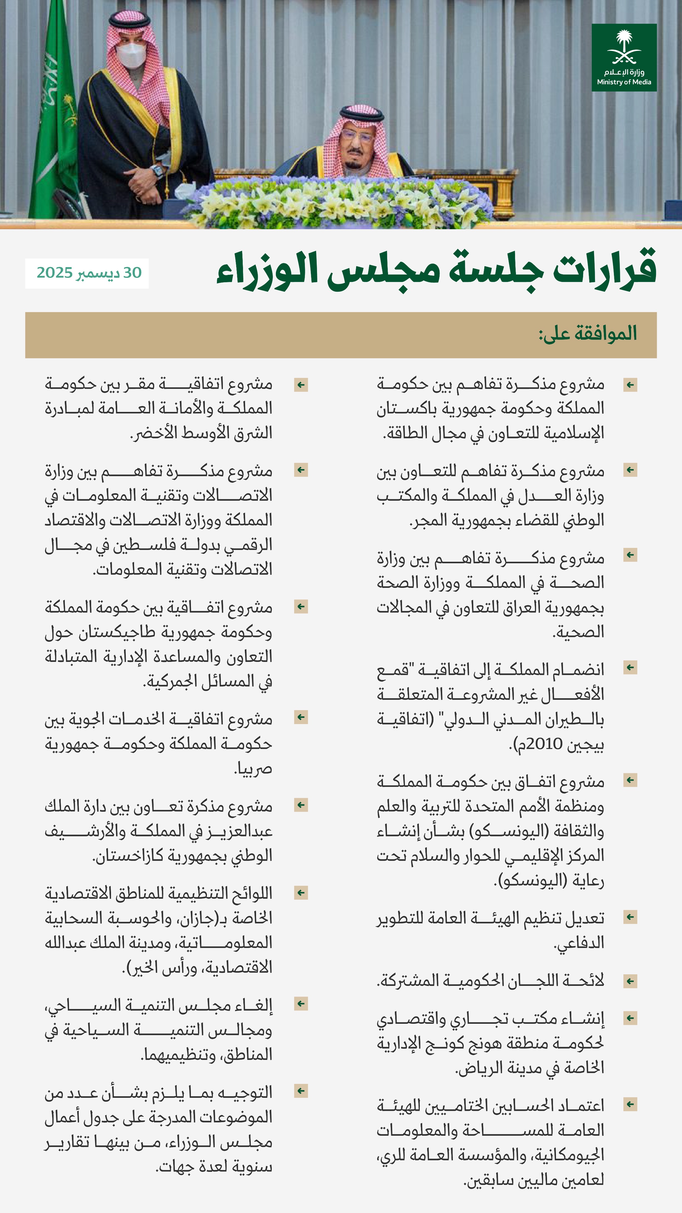 وافق على لائحة اللجان الحكومية المشتركة وإلغاء مجالس التنمية السياحية في المناطق؛ أبرز ما جاء في قرارات جلسة مجلس الوزراء 30 ديسمبر