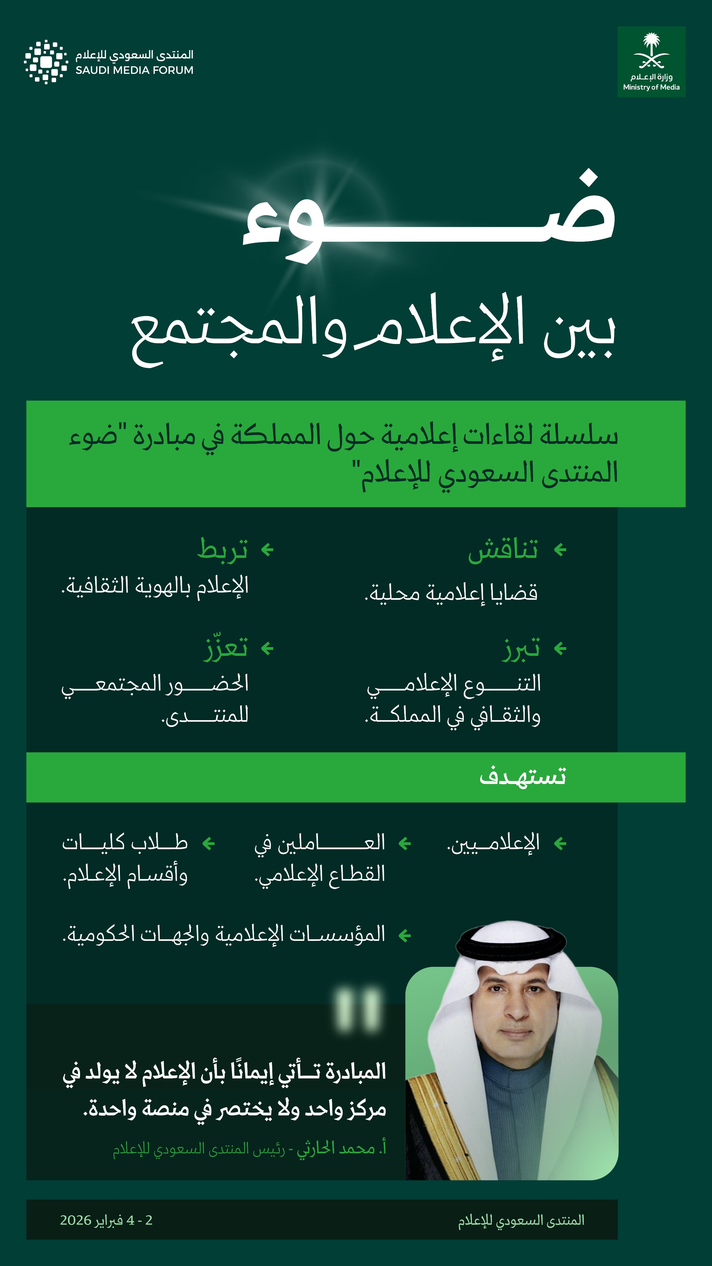 مبادرة ضوء للمنتدى السعودي للإعلام؛ تعقد سلسلة لقاءات إعلامية مشتركة مع الجهات ذات العلاقة، لمناقشة القضايا الإعلامية، وتعزيز الحضور المجتمعي.