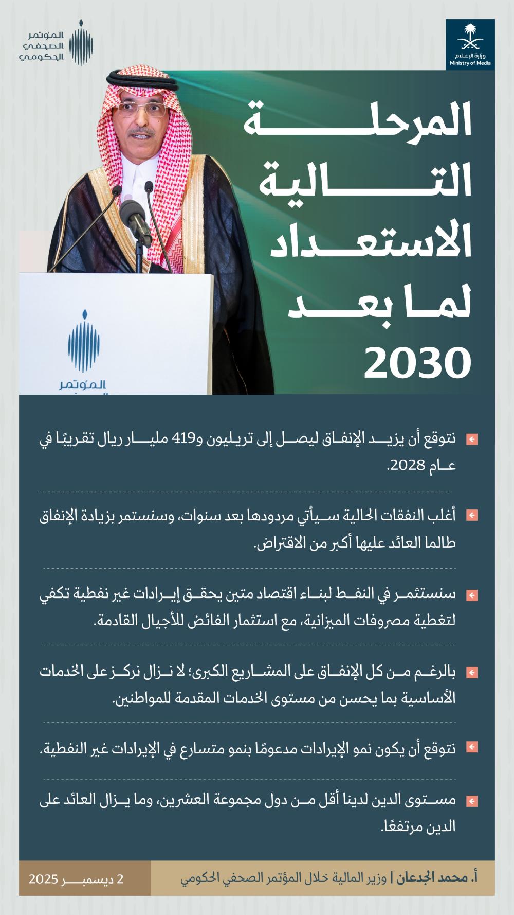 "المرحلة التالية ستبدأ من العام القادم، وهي مرحلة تعظيم الأثر والاستعداد لما بعد 2030"؛ وزير المالية خلال المؤتمر الصحفي الحكومي المصاحب لإعلان الميزانية العامة للدولة للعام المالي 2026.