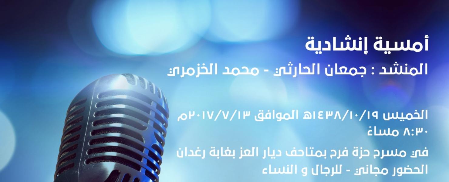 تنظم جمعية الثقافة والفنون بالباحة أمسية إنشادية يقدمها المنشدان جمعان الحاثي، ومحمد الخزمري، يوم الخميس المقبل 1438/10/19هـ الموافق 2017/7/13م عند الساعة 8:30 مساءً، وسوف تقام الأمسية في مسرح حزة فرح بمتاحف ديار العز بغابة رغدان بالباحة، والفعالية مجاناً، والحضور متاح للرجال والنساء.
