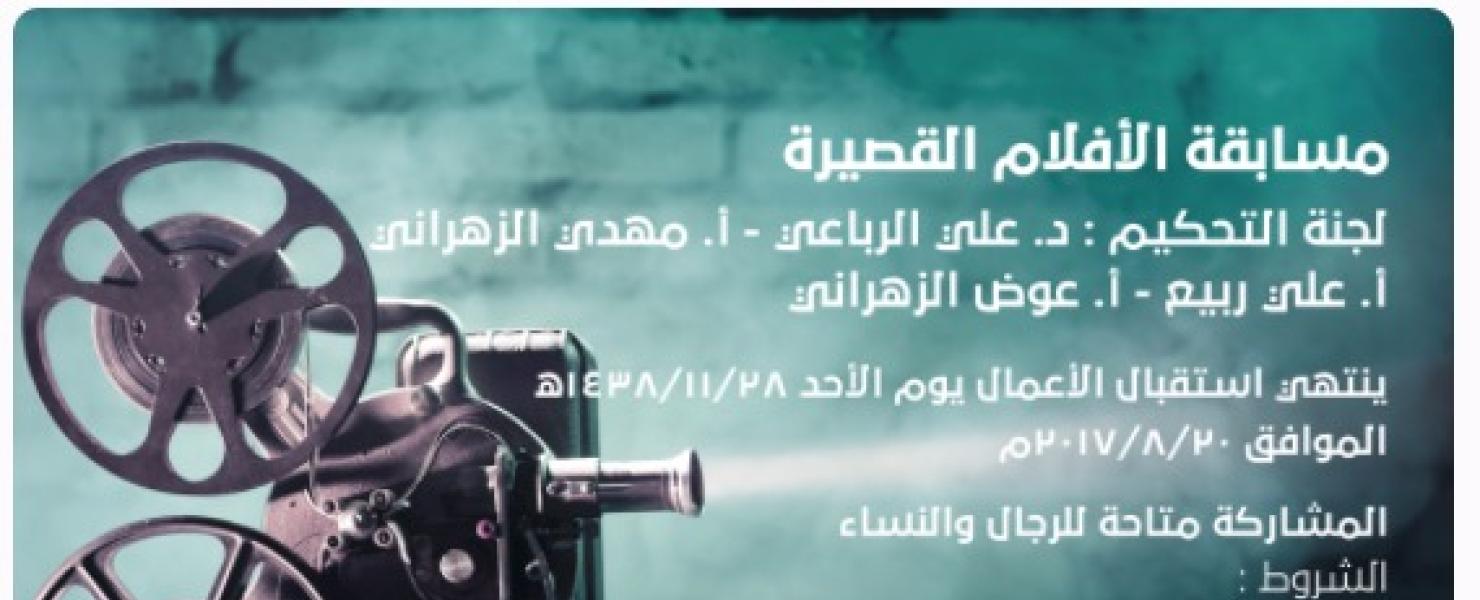 تنظم جمعية الثقافة والفنون بالباحة مسابقة الأفلام القصيرة يقدمها لجنة التحكيم: د. علي الرباعي- أ. مهدي الزهراني-أ. علي ربيع-أ. عوض الزهراني، ينتهي استقبال الأعمال يوم الأحد 28/11/1438 هـ الموافق20/8/2017 م، وسوف تقام المسابقة في مقر جمعية الثقافة والفنون بالباحة، المشاركة متاحة للنساء والرجال .